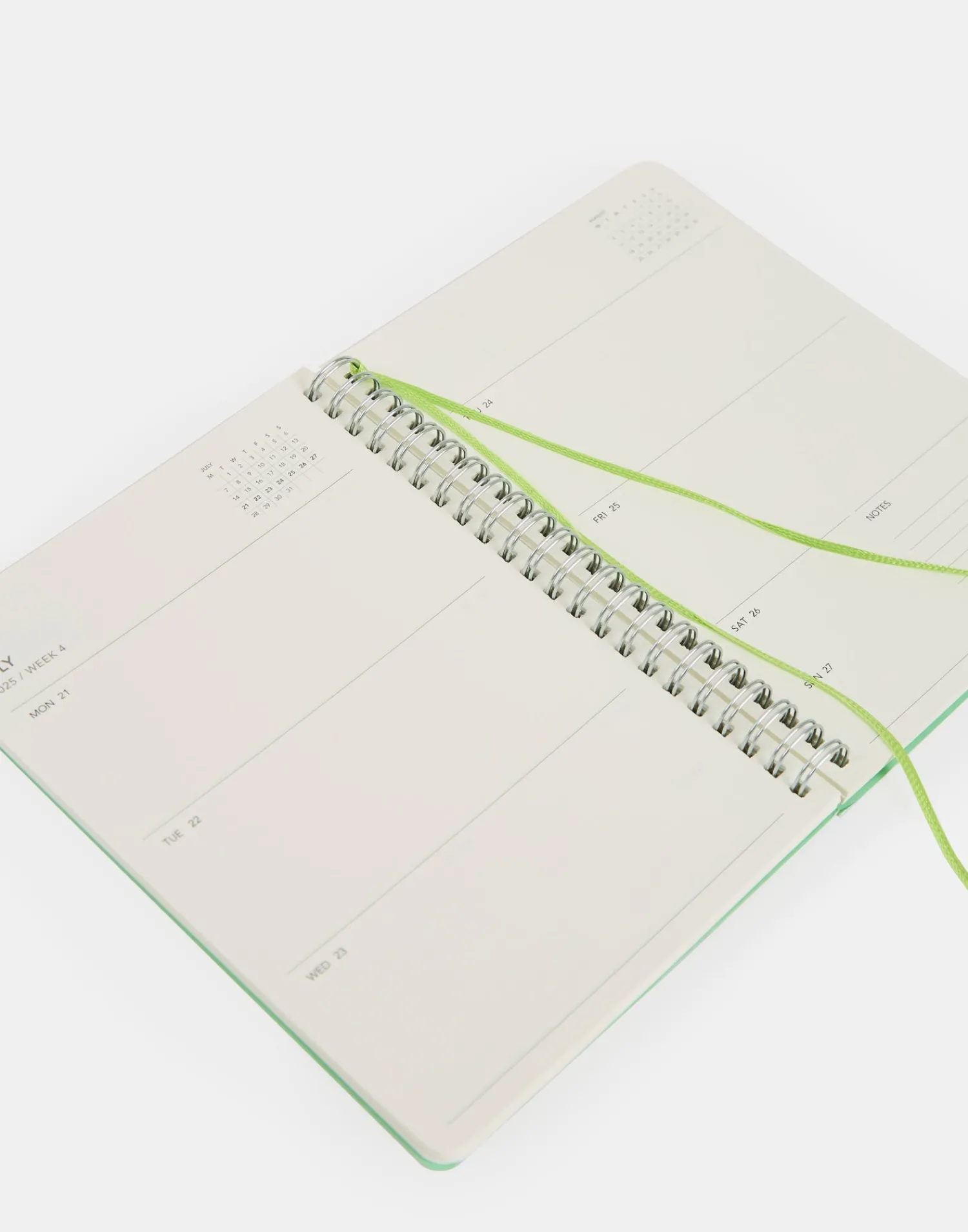 Agenda escolar con organización y visualización semana vista, desde septiembre 2024 a septiembre 2025. Con espiral metálica, hojas para apuntar notas y goma elástica.