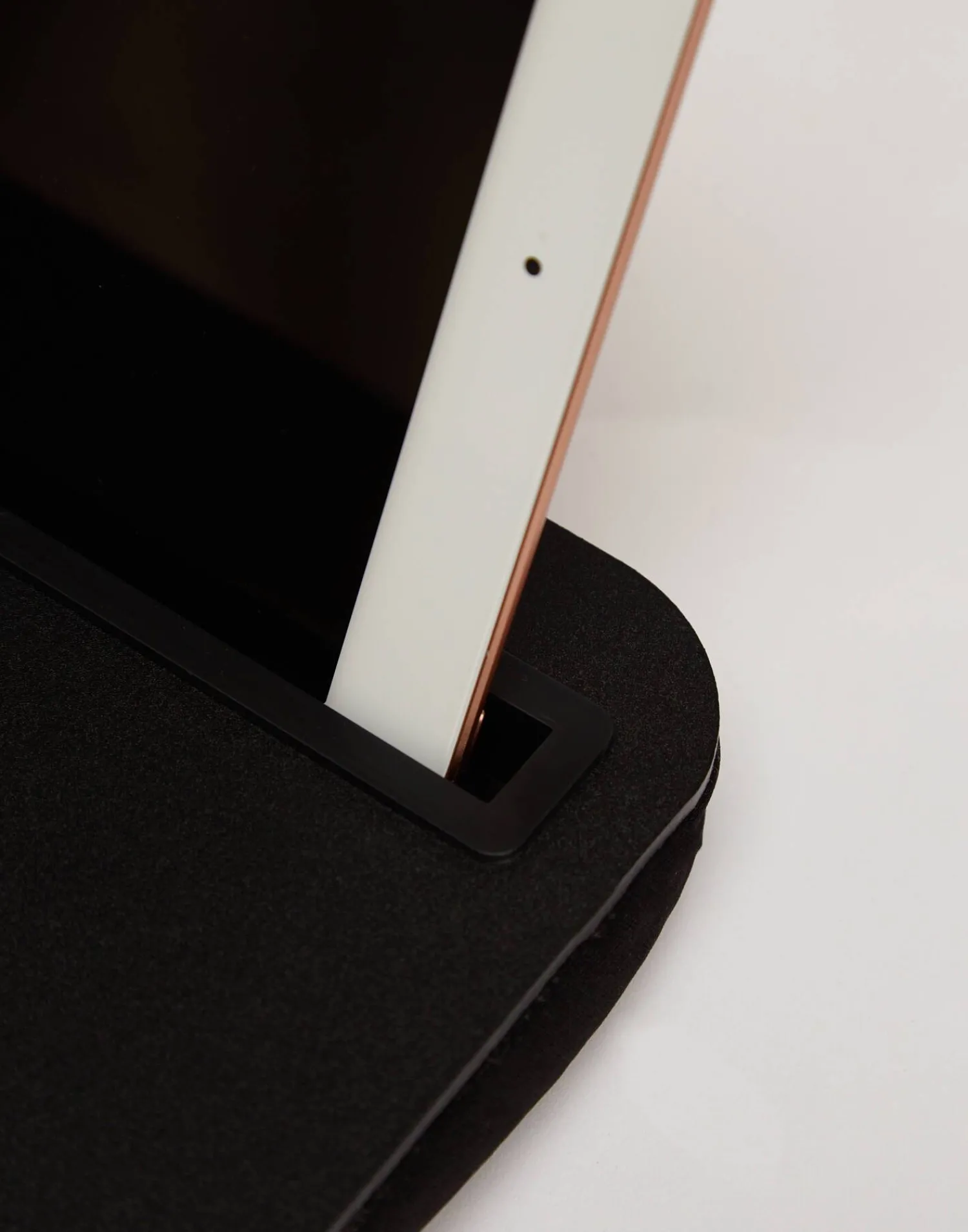 Bandeja con base acolchada y hueco para tablet. Ideal para trabajar, leer, escribir, jugar o ver películas desde tu tablet.