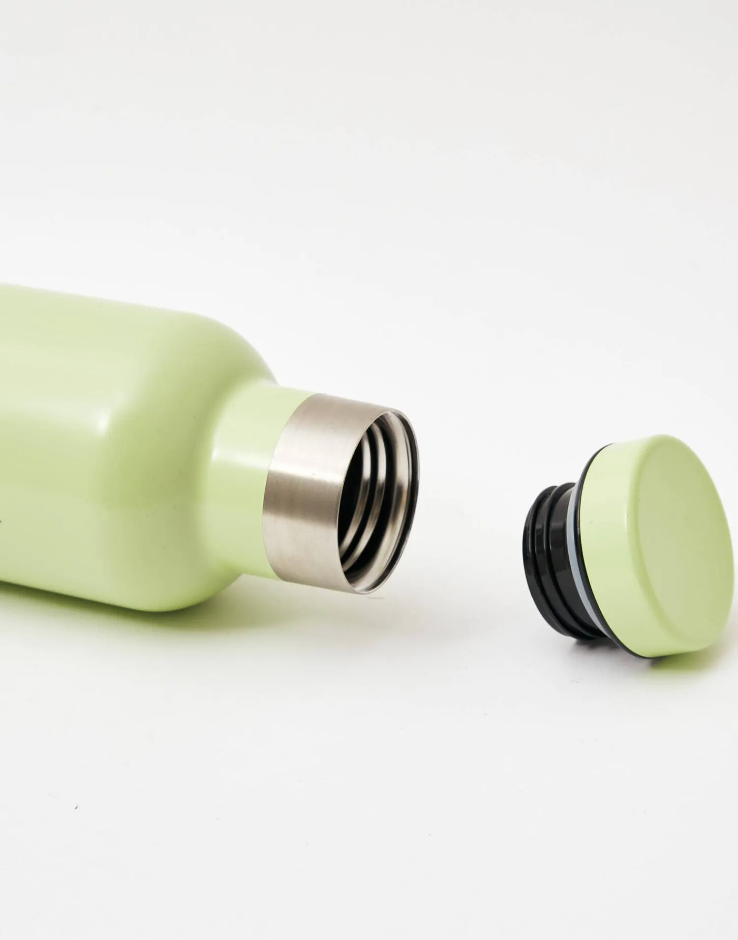Botella de acero inoxidable con mensaje en la parte frontal.