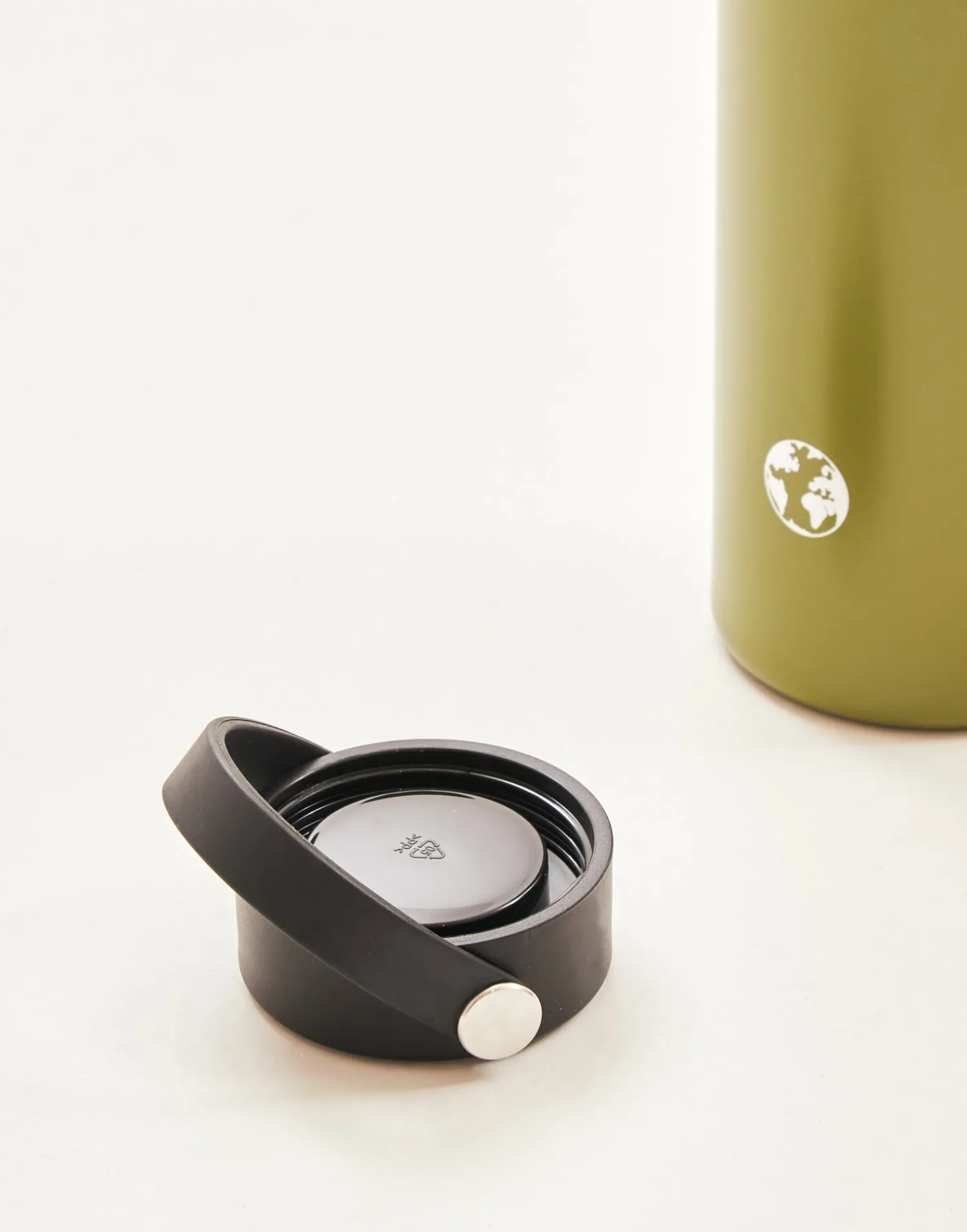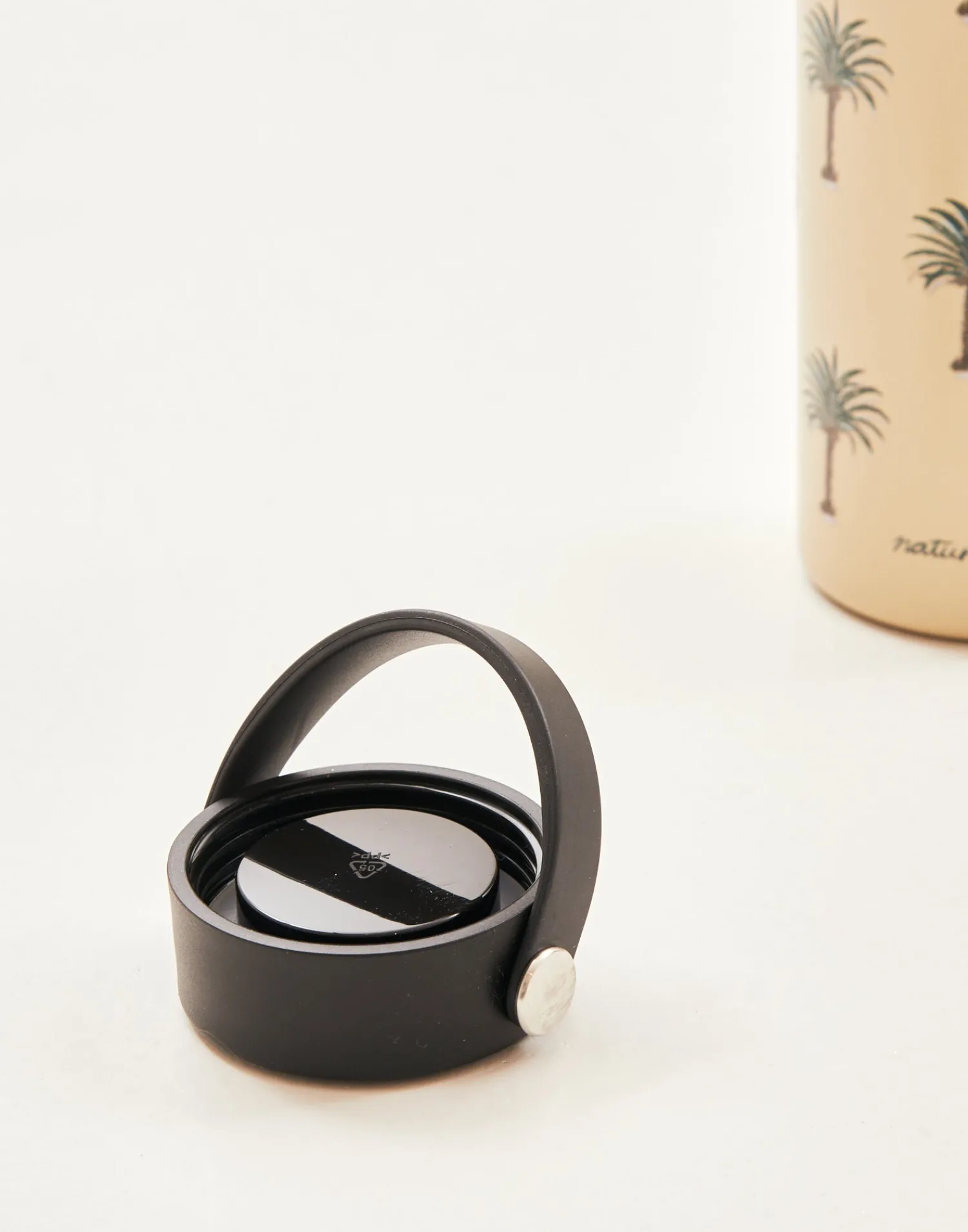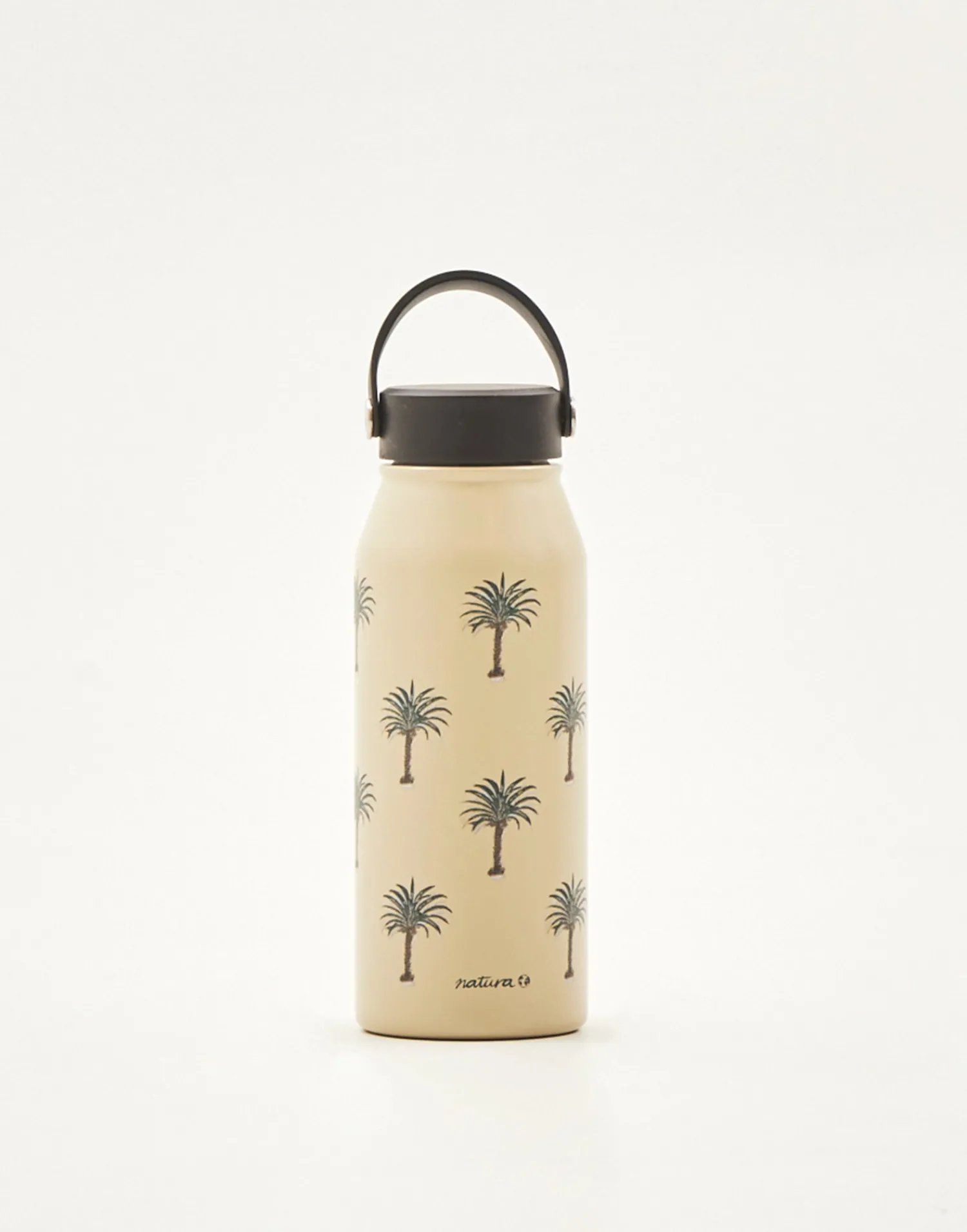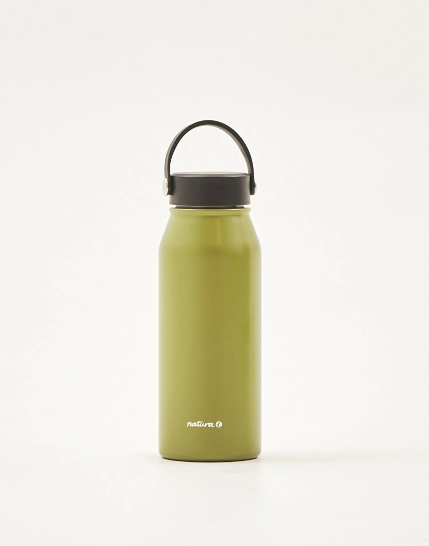 Botella reutilizable de acero inoxidable que puede utilizarse como termo. Acabada en tapón con asa.