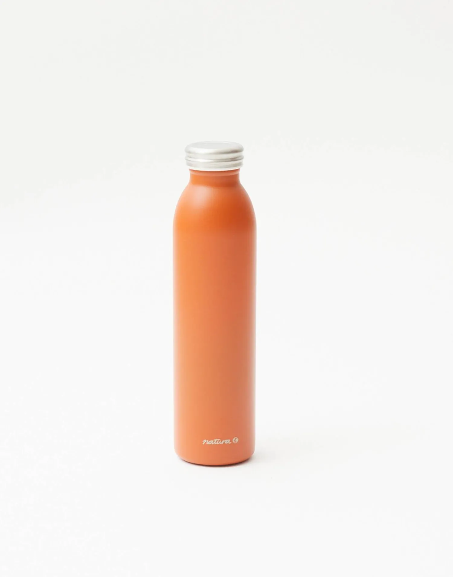 Botella metálica que puede utilizarse como termo. Base gomosa antideslizante para amortiguar golpes.