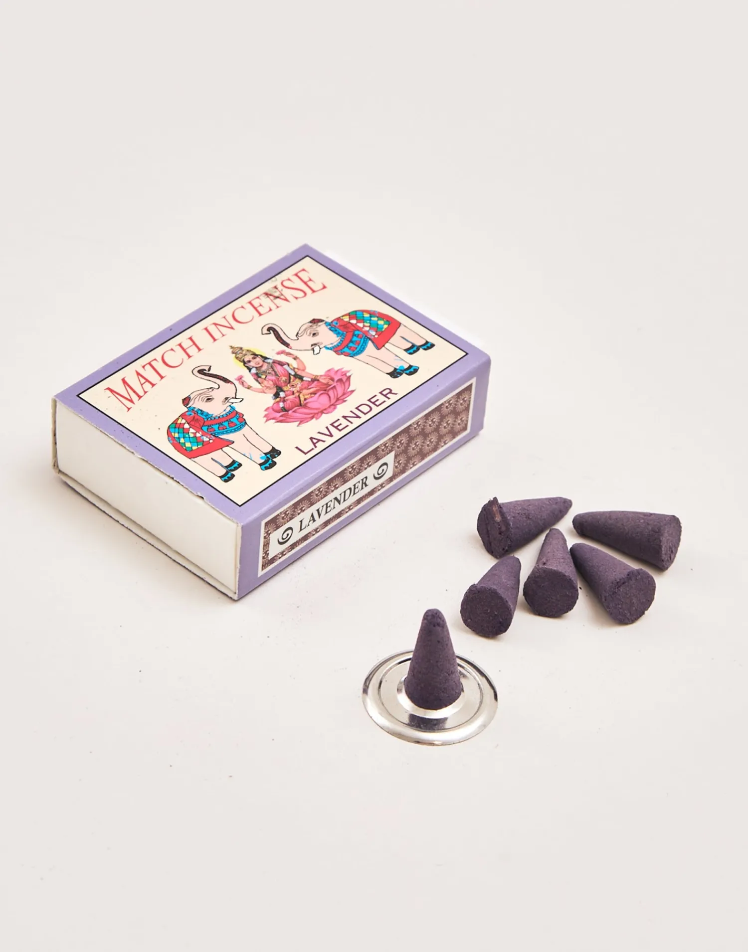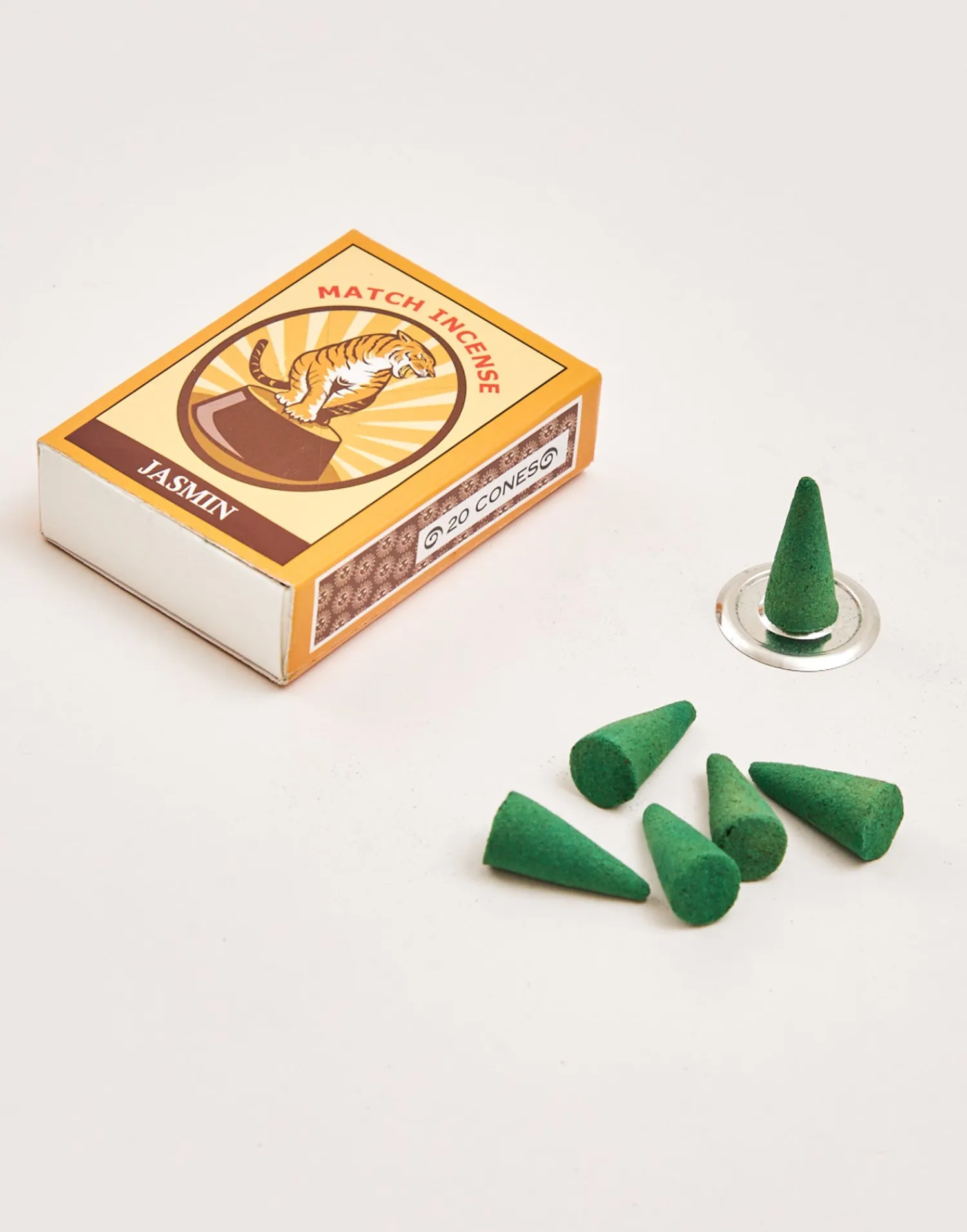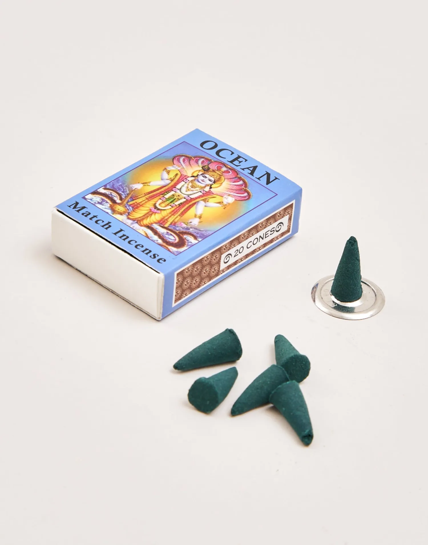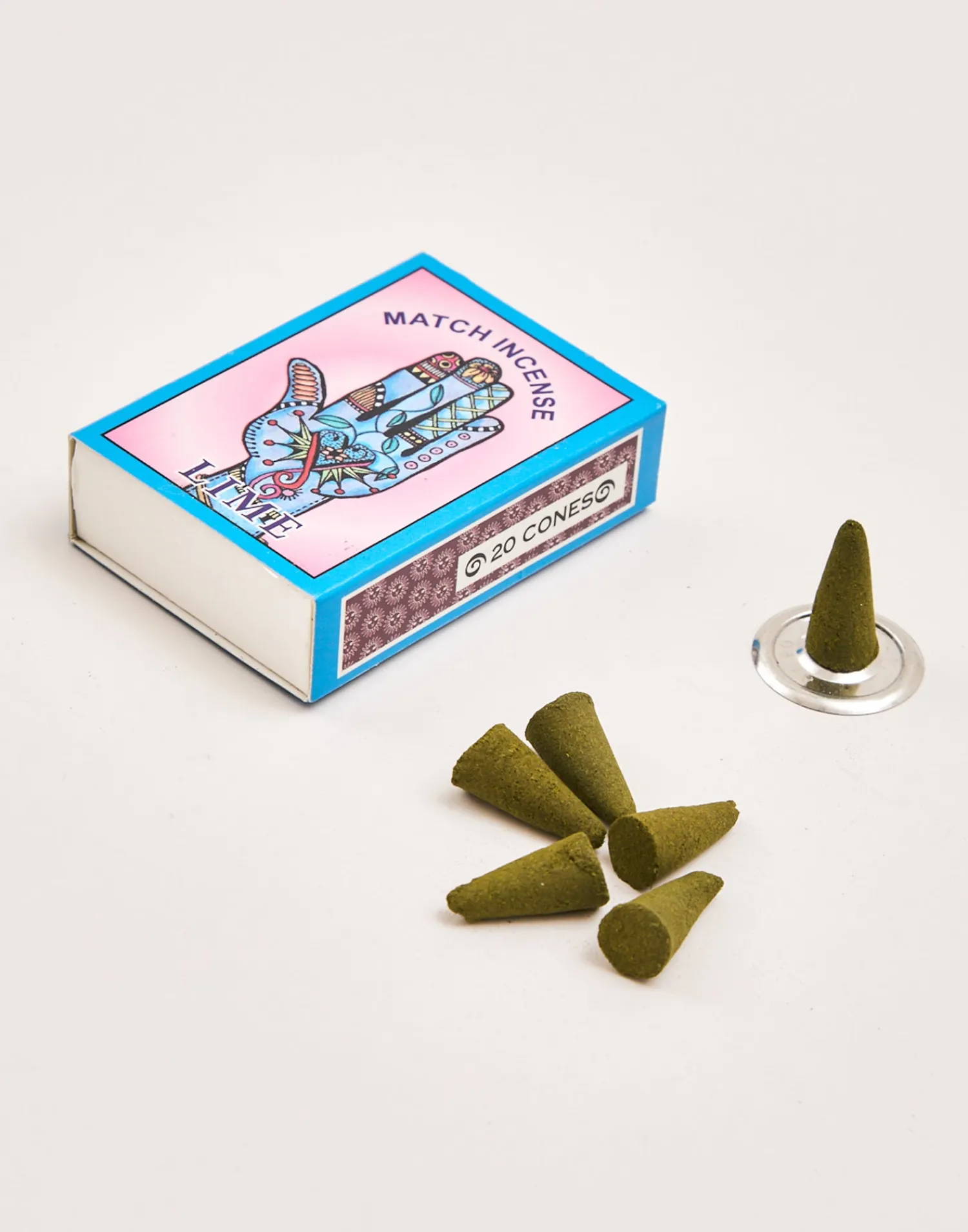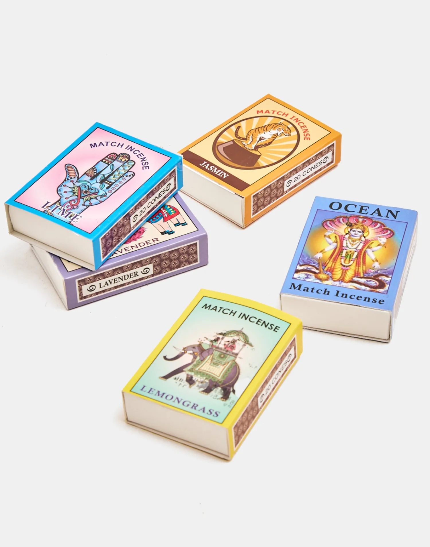 Caja con 20 inciensos en conos. Diseño inspirado en las cajitas de cerillas indias.