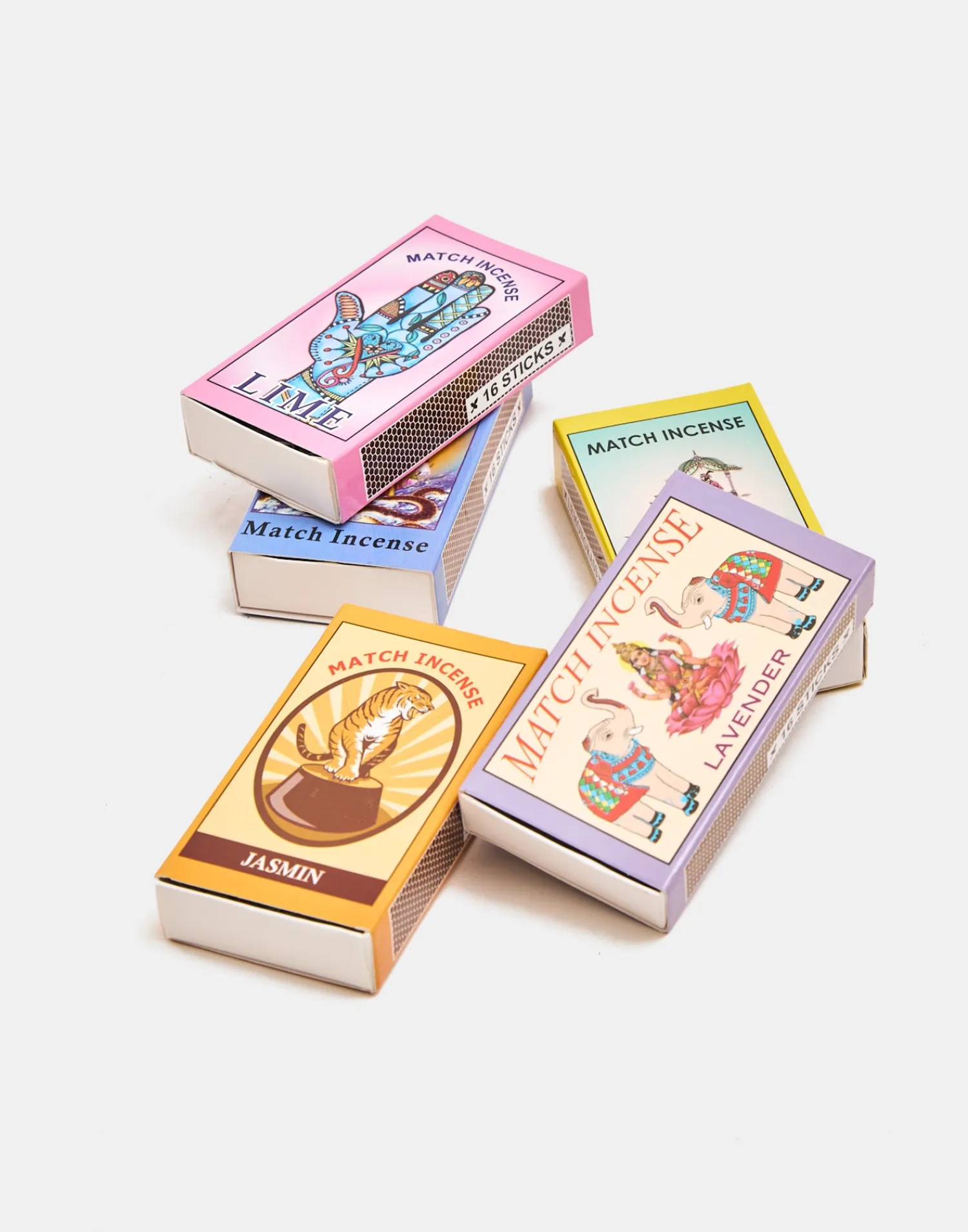 Caja con 16 inciensos en sticks. Diseño inspirado en las cajitas de cerillas indias.