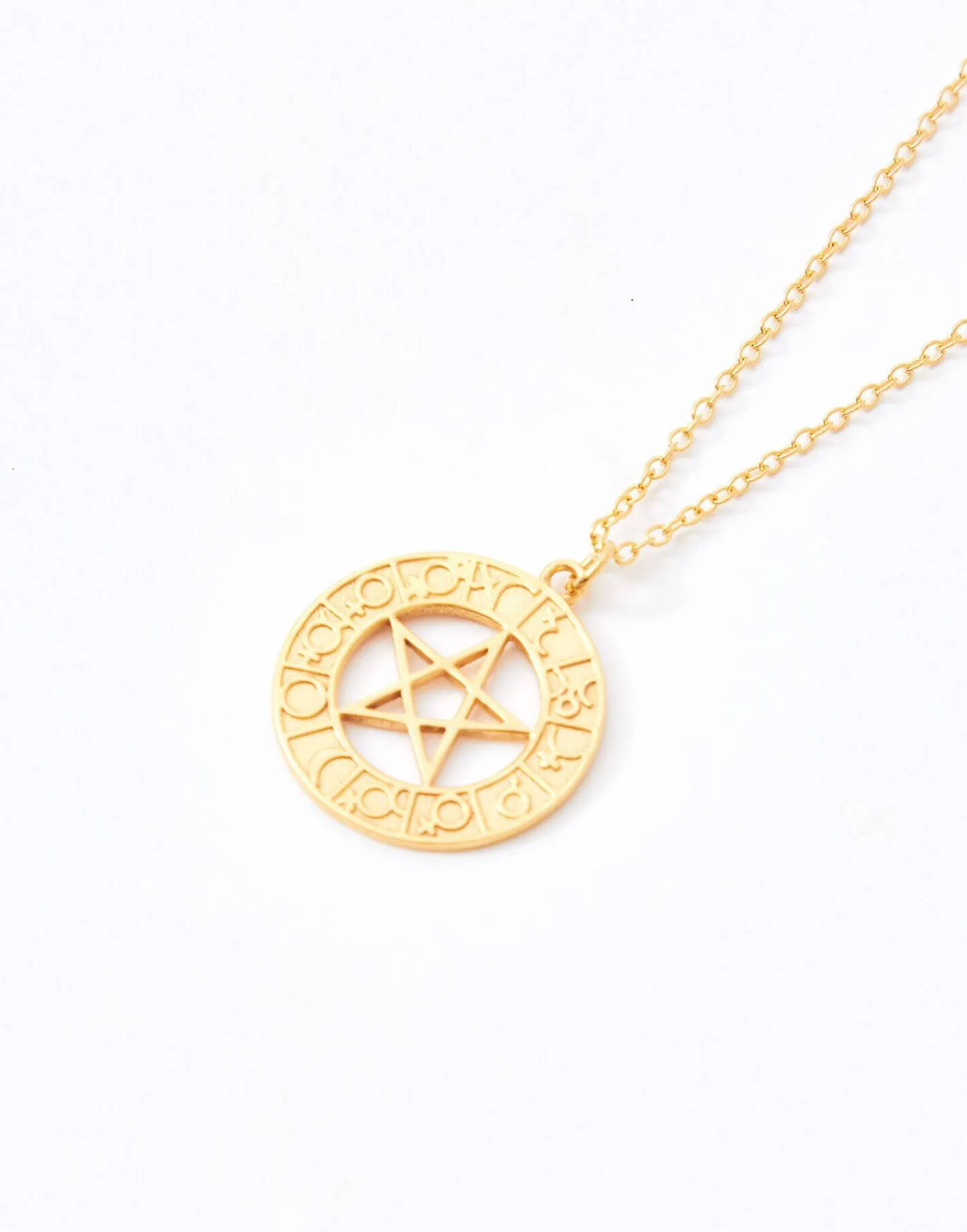 Collar bañado en oro con colgante de medalla. Signos del zodíaco representados en las dos caras de la medalla.