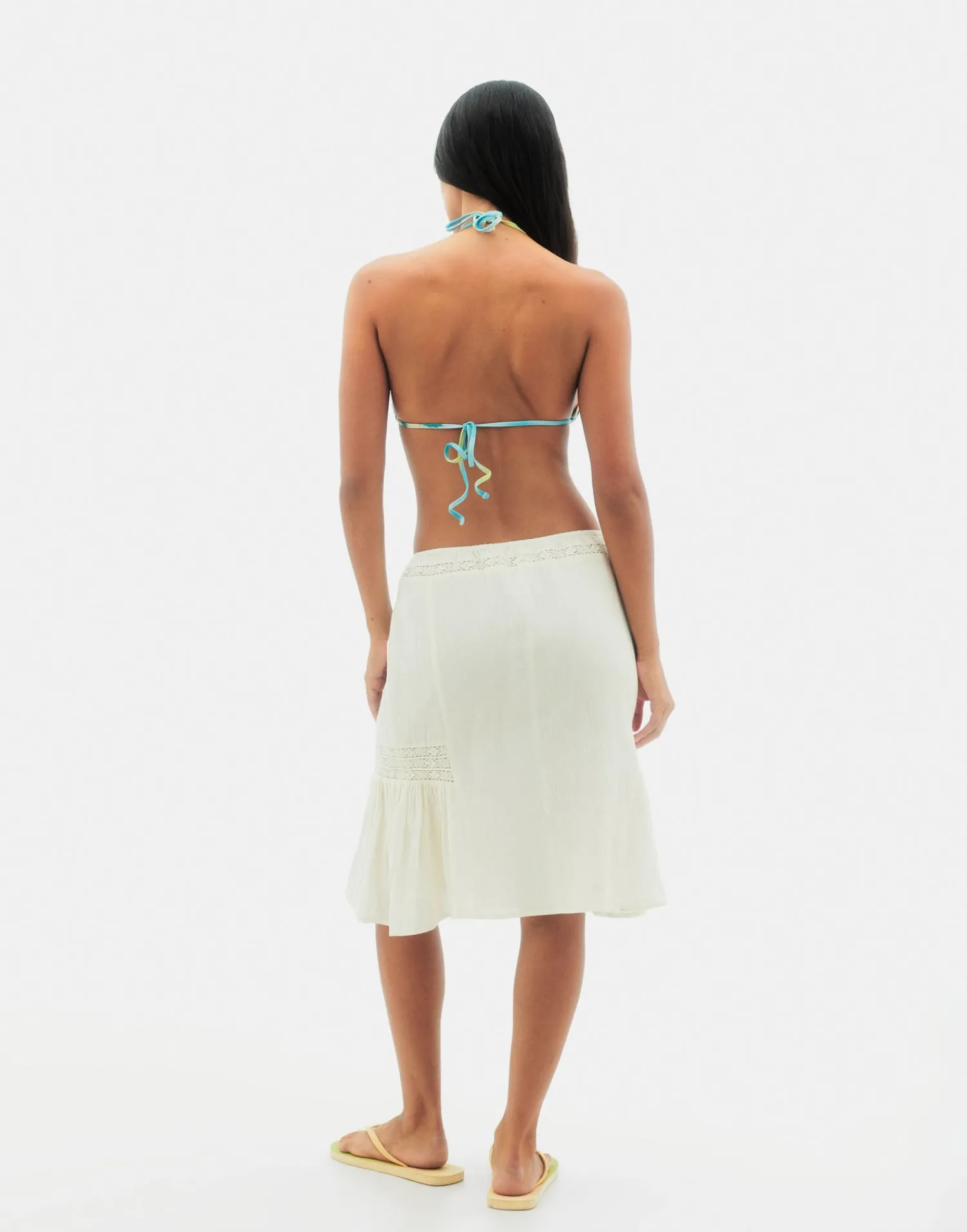 Falda midi de algodón, con cintura elástica, detalle de volantes y aplicación de encaje.