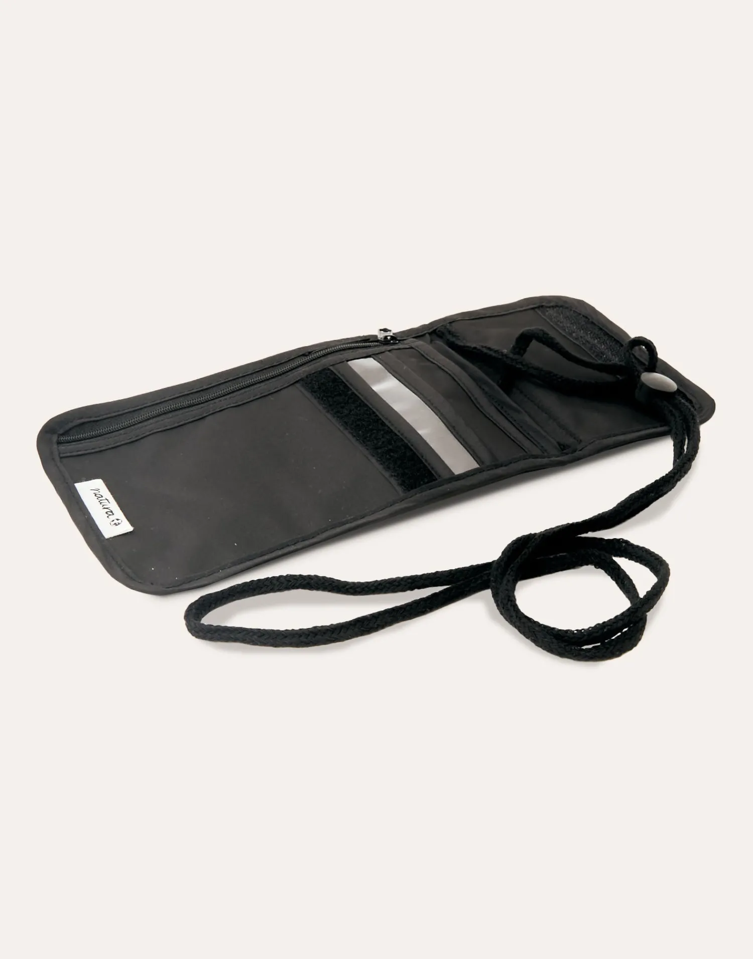 Cartera con cordón para colgar al cuello y cierre antirrobo.