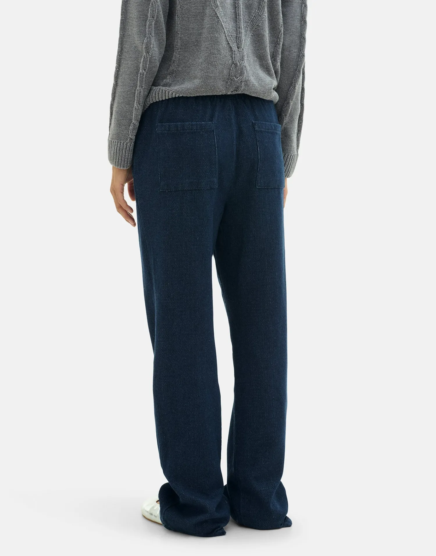 Pantalón de algodón con acabado denim. Diseño de pernera ancha, con cintura elástica ajustable mediante lazo y cuatro bolsillos.
