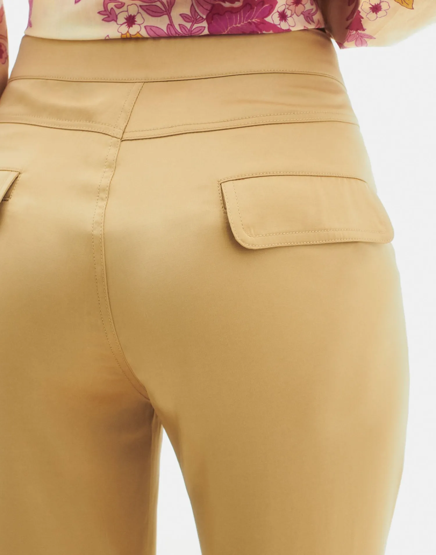 Pantalón con bolsillos delanteros y pernera recta. Detalle de tejido efecto brillo y cierre frontal con cremallera y gancho.