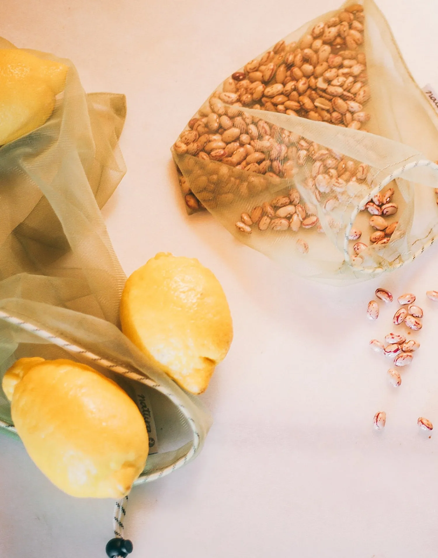 Set de 3 bolsas de compra para frutas, verduras y productos a granel. Duraderas, ligeras y reutilizables.