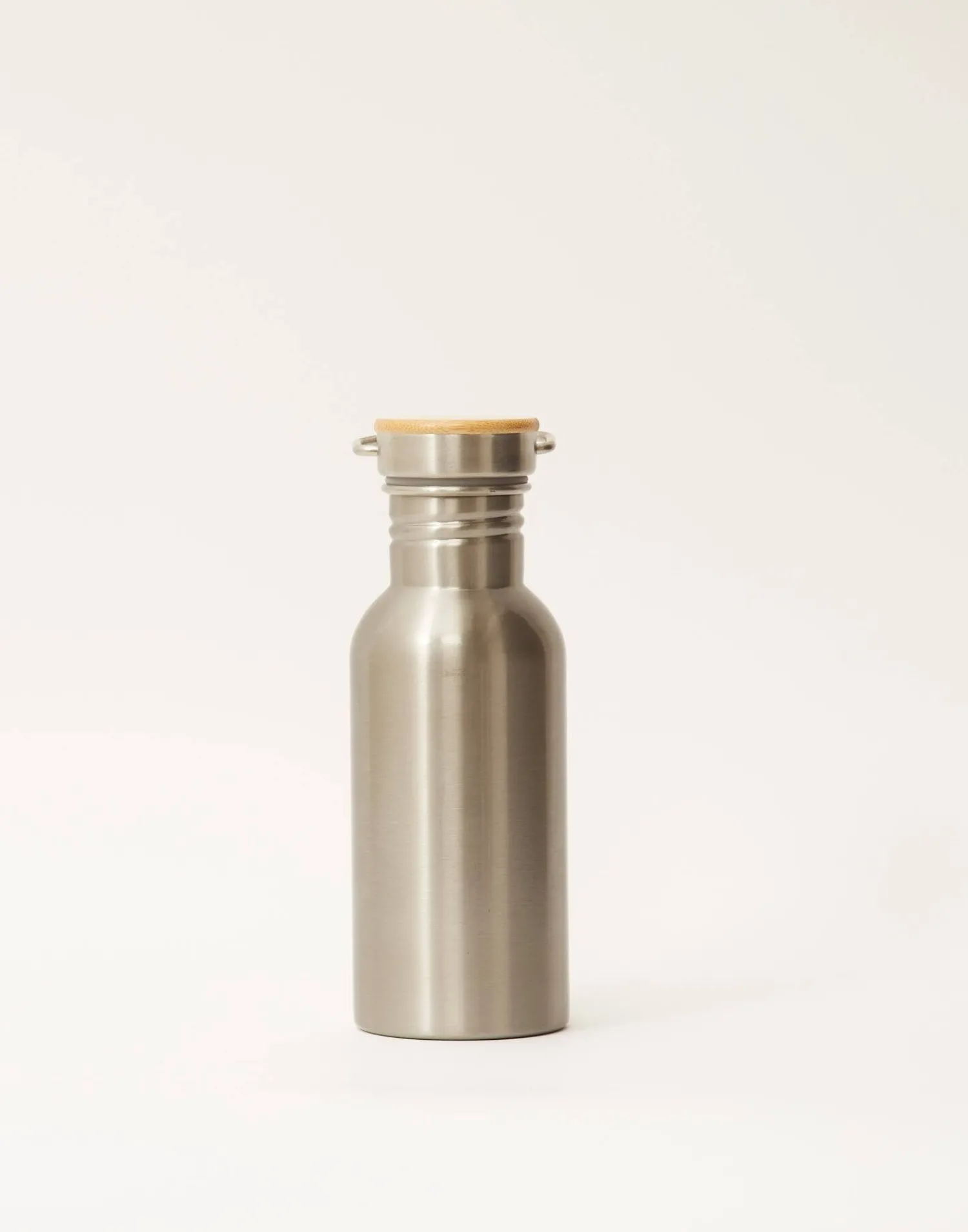 Botella reutilizable de acero inoxidable con detalle de asa en el tapón.