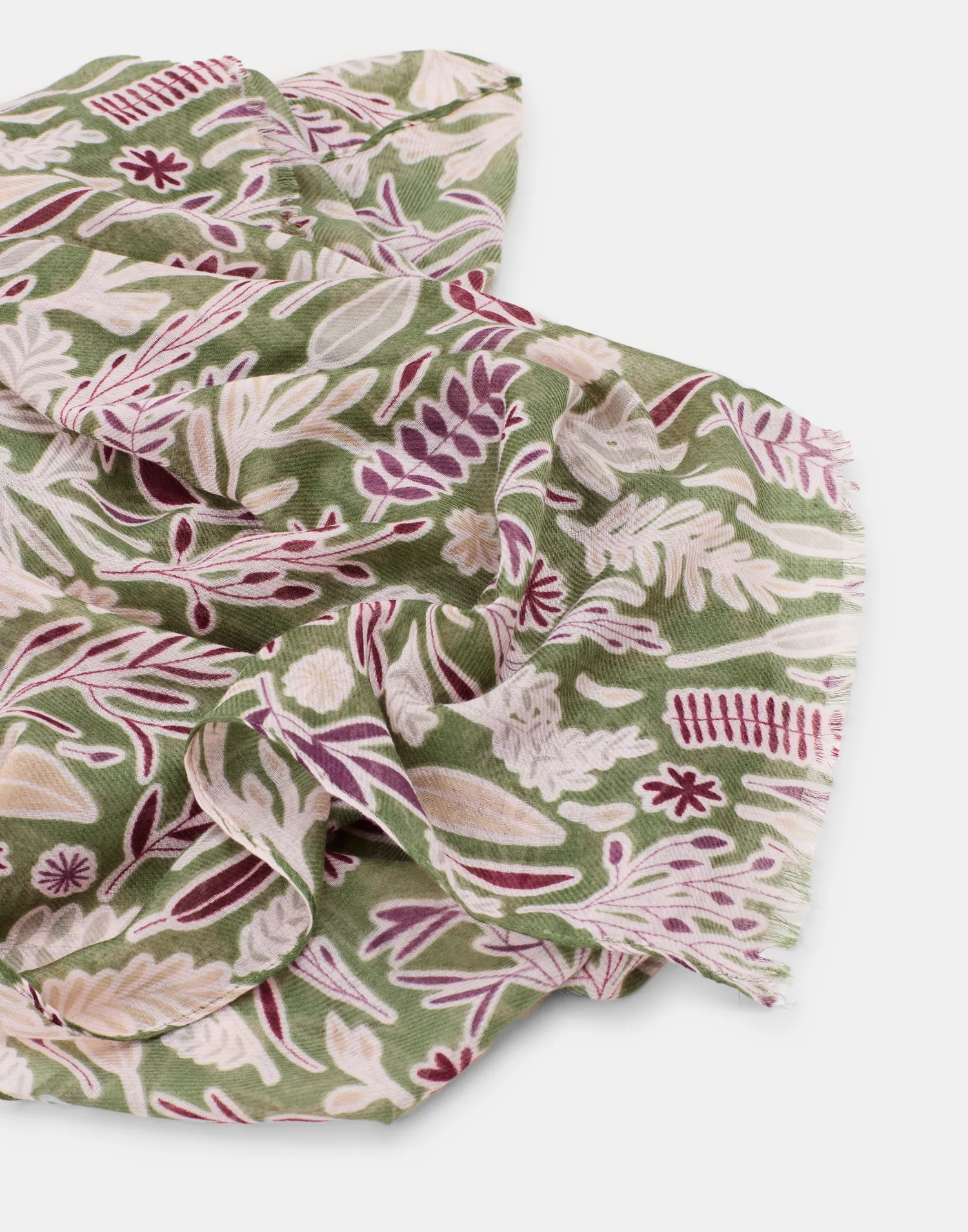 Pañuelo con estampado de hojas con terminaciones deshilachadas.