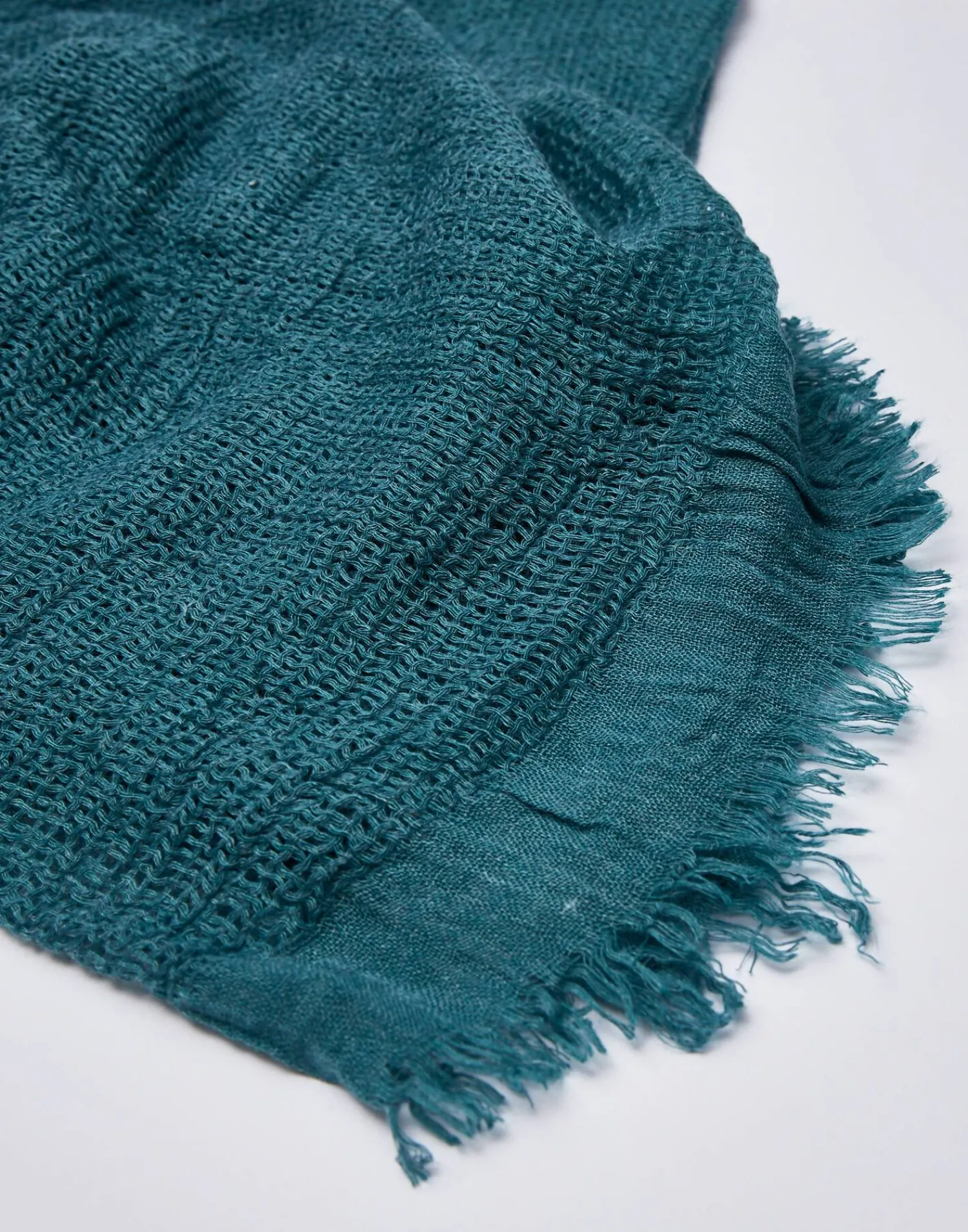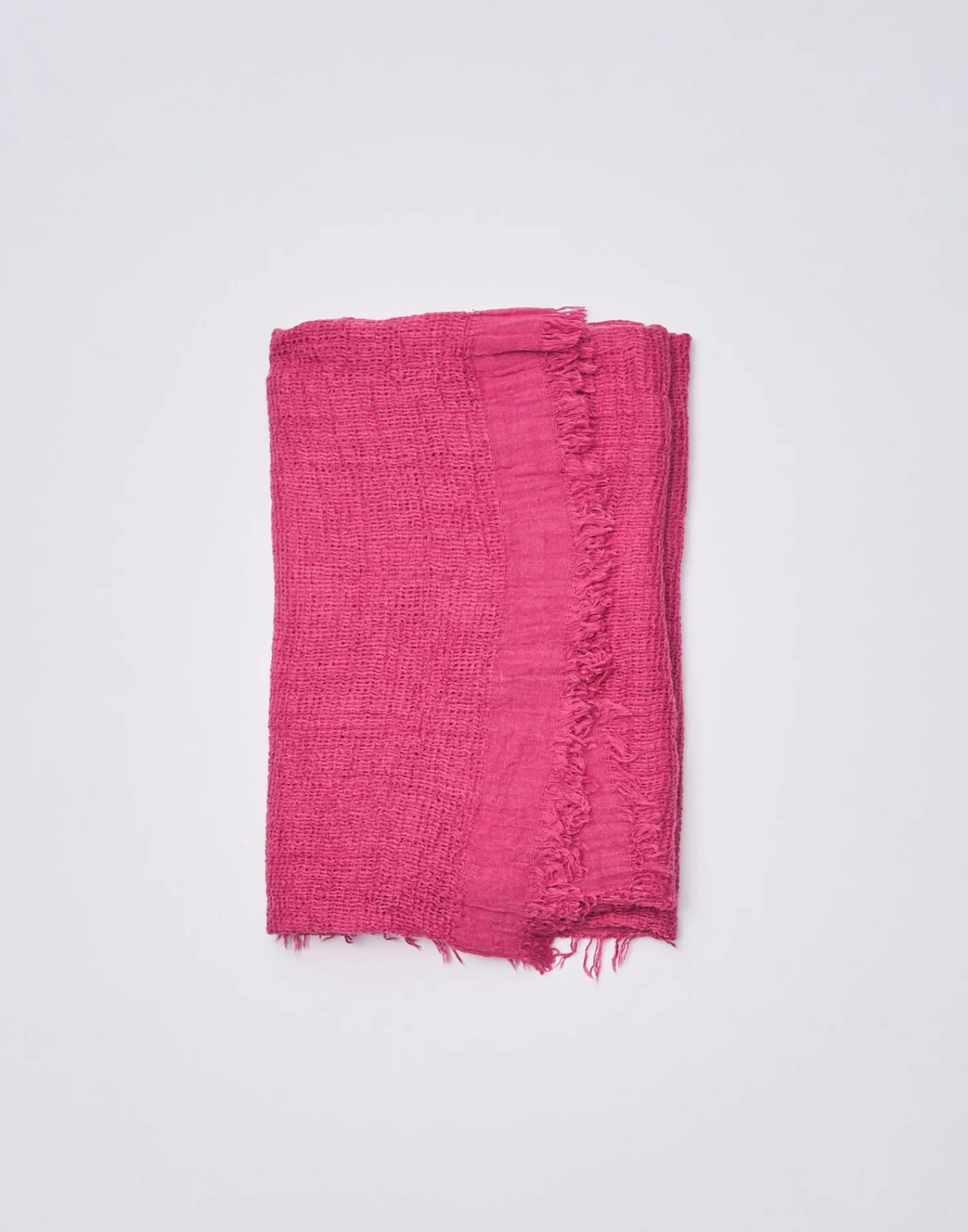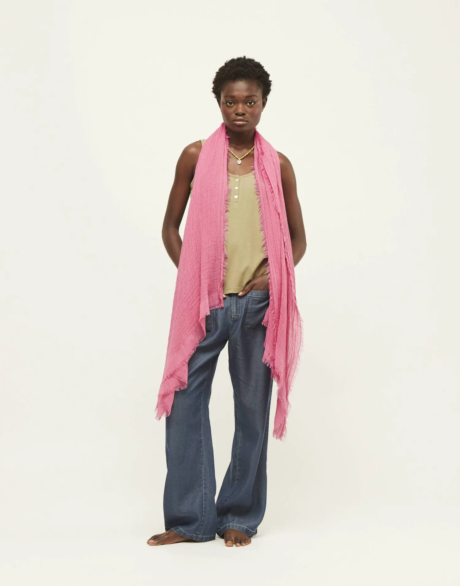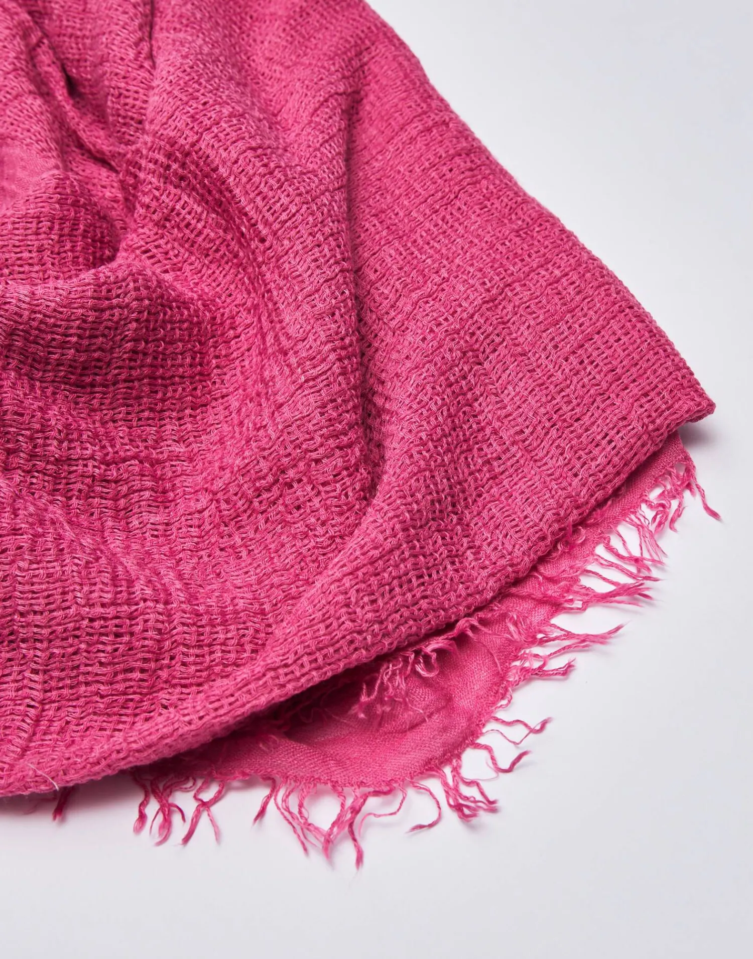 Pañuelo liso en mezcla de poliéster y viscosa con terminaciones deshilachadas.