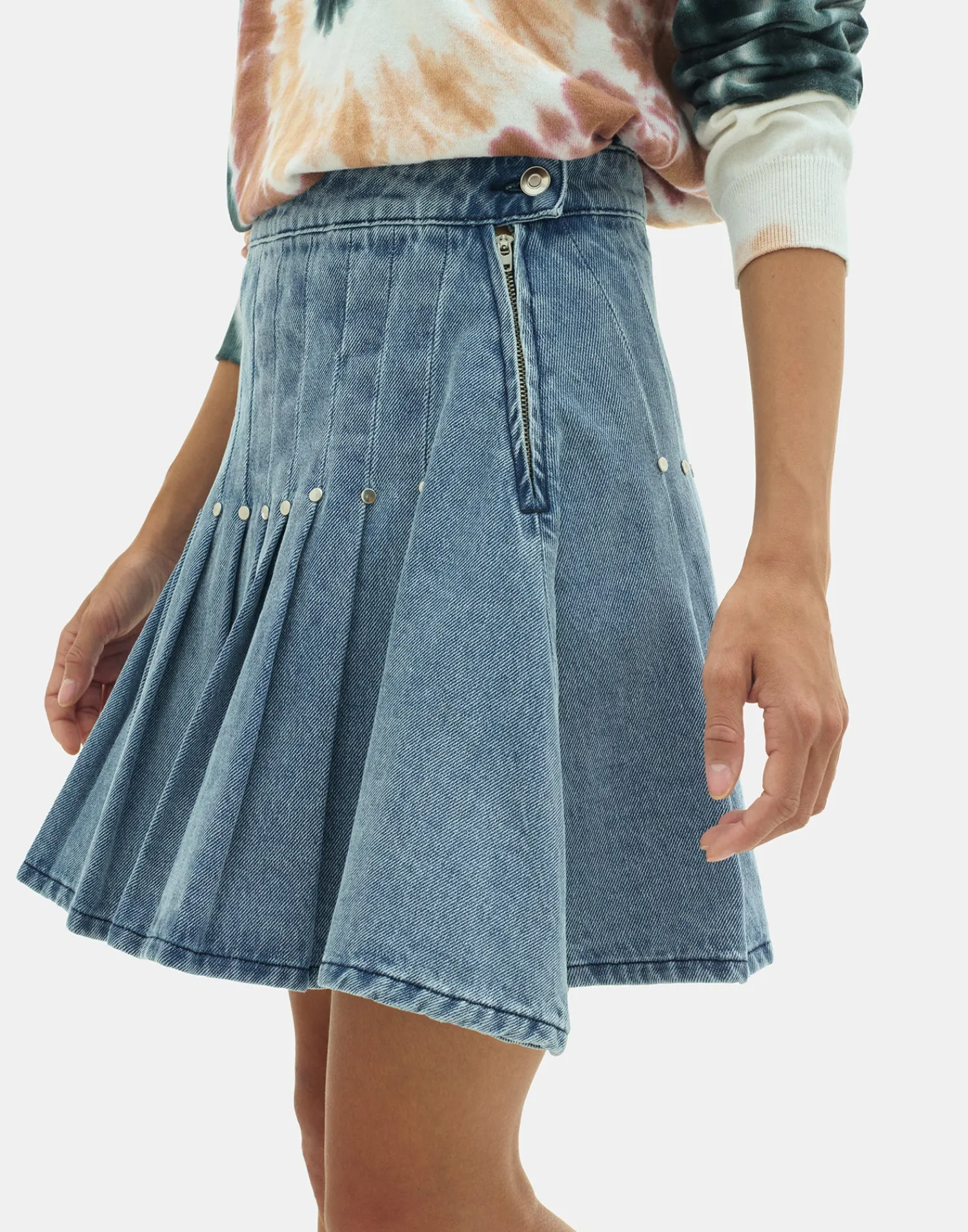 Minifalda tejana con pliegues y detalle de tachuelas. Cierre de cremallera con botón en el lateral.