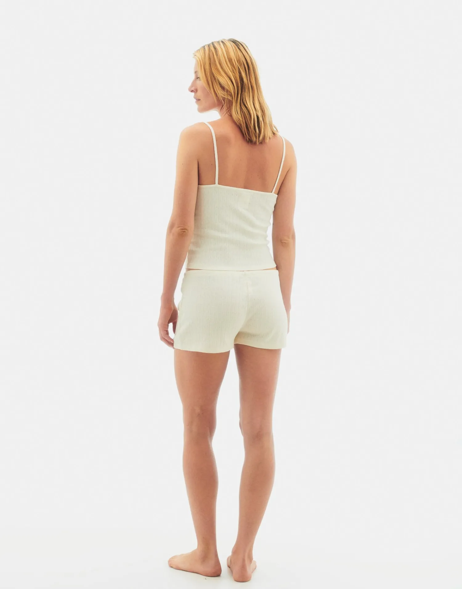 Pantalón corto en tejido desagujado con cintura ajustable mediante lazo.