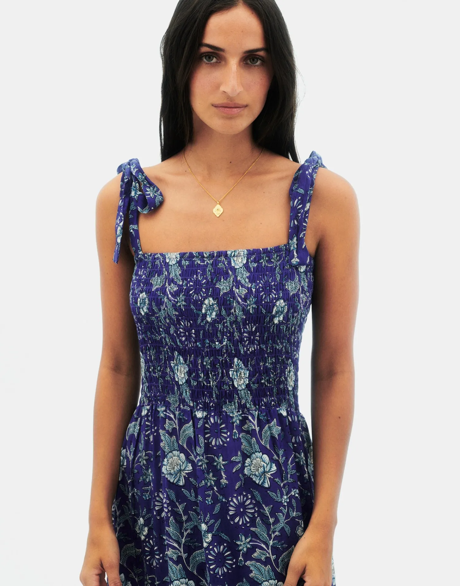 Vestido largo con estampado floral, escote recto y elástico tipo nido de abeja y tirantes ajustables mediante lazo.